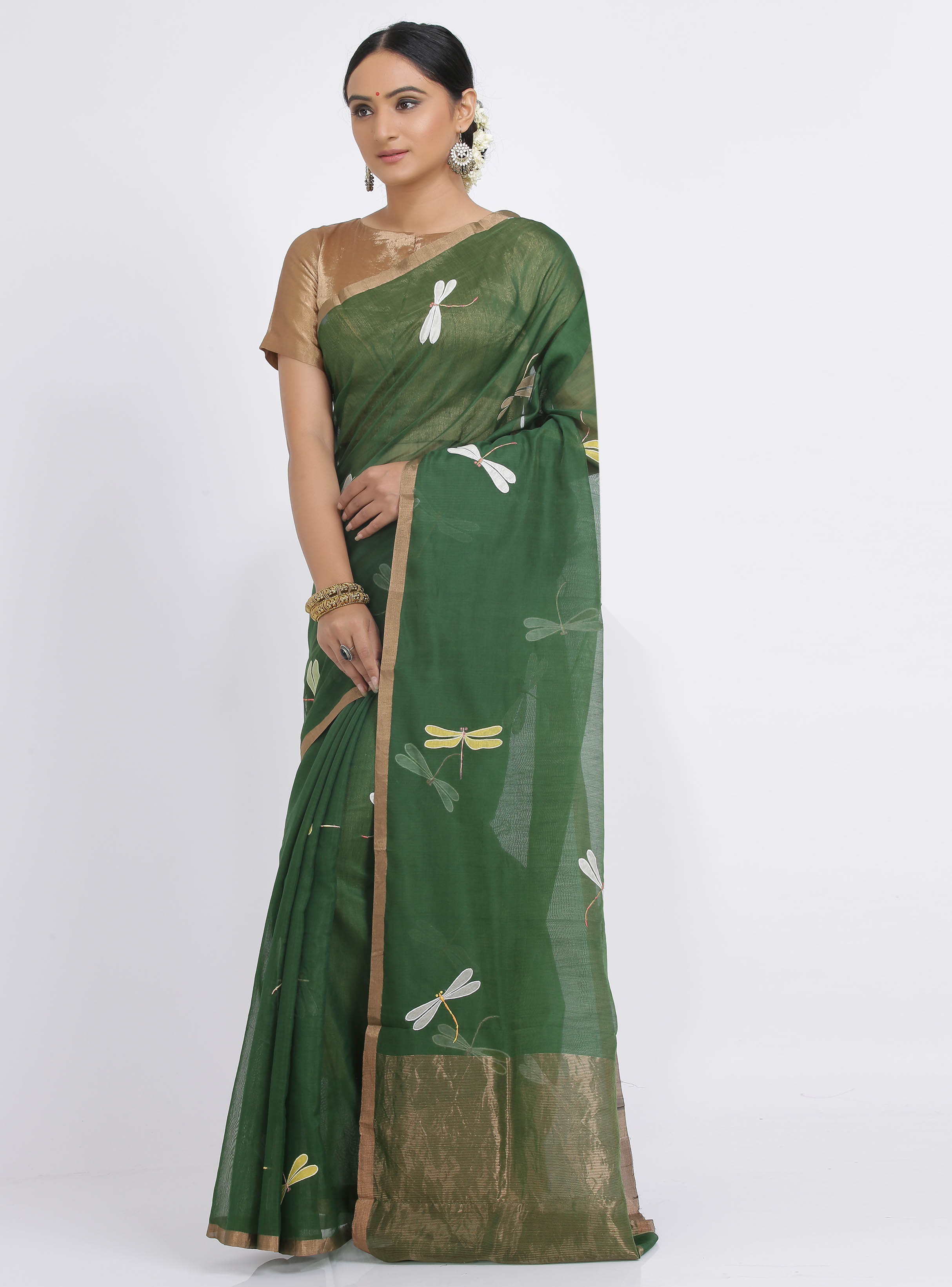 | Design | Woven zari stripes pallu and plain running blouse with all over embroidered / applique Patanga booti Chanderi saree. |